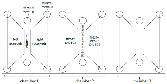 To observe PMN migration, NET formation, and ROS production, 3D-µ-Slide chemotaxis chambers (Ibidi GmbH, Graefelfing, Germany) were used. One slide consists of three separate chambers, which have a channel in the middle and a reservoir to the right and left of each (Figure 3).