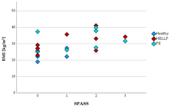 When SPASS values were plotted against the BMI, healthy expectant women were found only in the SPASS groups 0 or 1 (Figure 4).
