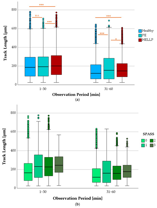 Observation of PMN tracks according to health status showed between 983 and 9035 tracks per box and a median length of 195 µm during the first 30 min and 140 µm between 31 and 60 min after starting the microscope. During both observation periods, a significant difference in TL was always observed between the HELLP and the healthy groups (p < 0.001). The TL of the PE patients and the healthy group differed significantly only in the observation period of 31–60 min (p < 0.001) (Figure 5a).