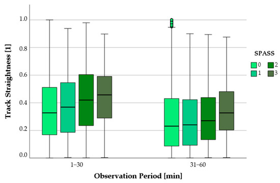 Comparison of track straightness of PMNs depending on the SPASS index over the course of the first hour; small circles in graphics mark statistical outliers (≥1.5 × IQR).