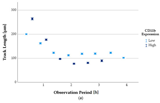 To exclude artefacts, a TL ≥ 25 µm (about twice the diameter of a PMN) and simultaneously a track duration ≥ 900 s were used. The analysis of the image data was based on previous studies [27]. Briefly, a total of 720 image series per channel were analyzed using Imaris software (version 9.0.2, Bitplane, Zurich, Switzerland). To evaluate cell migration tracks, the software detected and tracked migrating cells semi-automatically for 1 h in two 30 min time periods or over an observation period of 1–4 h. The data were then exported to Excel (Microsoft Corp., Redmond, WA, USA).