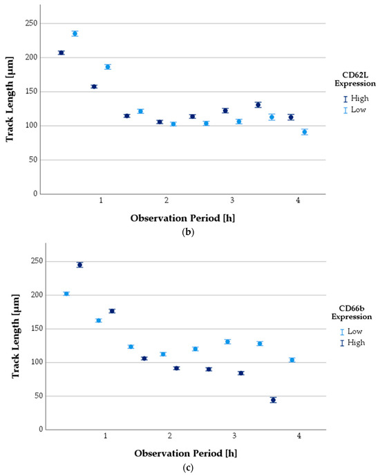 Comparison of mean PMN TL over the observation period depending on surface antigen expression status (error bars: 95% CI). TL depending on expression of CD11b (a), CD62L (b), and CD66b (c).