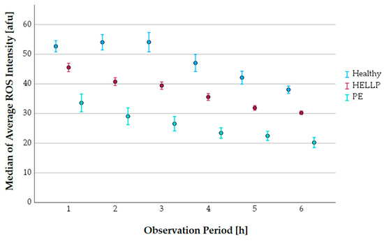 PMNs can produce ROS. The median of the average ROS intensity was analyzed in 1 h observation periods in relation to the health status of the pregnant women (Figure 8).