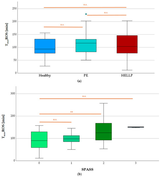 TmaxROS depending on the health status of the pregnant women (a) or the SPASS values (b); n.s. means not significant, ** p < 0.01; small circles in graphics mark statistical outliers (≥1.5 × IQR).