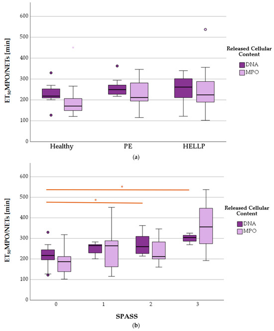 ET50NETosis (ET50MPO and ET50NETs) versus health status (a) and SPASS factor (b). Significant differences within the groups are marked as * (p < 0.05), small circles in graphics mark statistical outliers (≥1.5 × IQR).