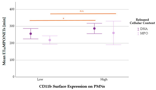 Mean ET50NETosis values of PMNs with low or high expressions of CD11b (error bars: 95% CI). Differences between groups are highlighted by n.s. (= statistically not significant) or * (p < 0.05).