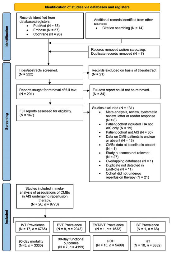 Studies considered eligible for inclusion met the following criteria: (a) patients diagnosed with AIS; (b) patients aged ≥ 18 years; (c) availability of data on AIS patients exhibiting CMBs; (d) consecutive patients undergoing reperfusion therapy, including IVT, EVT or bridging therapy, and (e) studies with robust methodological design deemed as a minimum sample of 20 patients. Exclusion criteria encompassed: (a) systematic reviews, meta-analyses, and case reports; (b) studies involving animal subjects; (c) studies lacking full-text availability; (d) studies lacking baseline CMB data, (e) studies involving intra-arterial thrombolysis, and (f) studies published in languages other than English or duplicate studies.