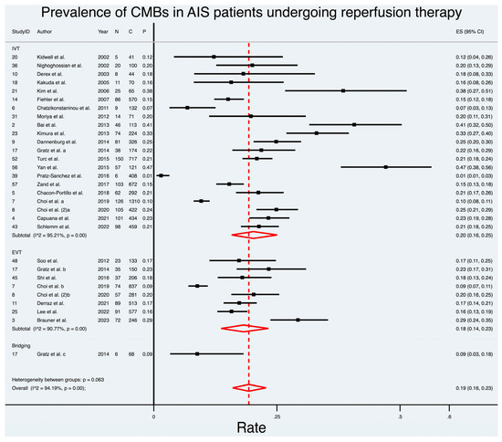 Prevalence of cerebral microbleeds in acute ischemic stroke patients undergoing reperfusion therapy [11,15,17,18,19,20,21,22,23,24,25,26,27,28,29,30,31,32,33,34,35,36,37,38,39,40]. Note: a, b and c correspond to cohorts receiving IVT, EVT and bridging, respectively, in the said study. Choi et al. [21] and Choi et al. (2) [22] refer to studies from 2019 and 2020, respectively. Abbreviations: CMB = cerebral microbleeds, AIS = acute ischaemic stroke, n = number of patients with CMBs, C = total cohort number, p = prevalence, IVT = intravenous thrombolysis, EVT = endovascular thrombectomy, ES = effect size, I2 = heterogeneity value, p = p-value.