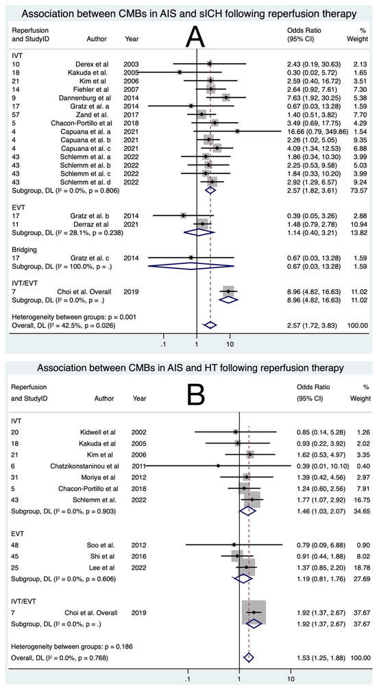 Forest plots of association of cerebral microbleeds with clinical outcomes: (A) symptomatic intracerebral haemorrhage (sICH) [11,15,18,19,21,23,25,26,27,28,29,36,40] and (B) haemorrhagic transformation (HT) [19,20,21,24,26,27,28,29,31,38,39] in acute ischemic stroke patients undergoing reperfusion therapy. Note: Capuana et al. a, b, c corresponds to cohorts assessed for sICH using the SITS-MOST, ECASS-II and NINDS criteria, respectively, in the said study. Schlemm et al. a, b, c, d correspond to cohorts assessed for sICH using the SITS-MOST, ECASS-II, ECASS-III, and NINDS, respectively. Gratz et al. [11] a, b, c and overall represent cohorts receiving IVT, EVT, Bridging and IVT and/or EVT, respectively, within this study. Abbreviations: CMBs = cerebral microbleeds, sICH = symptomatic intracerebral haemorrhage, HT = haemorrhagic transformation, IVT = intravenous thrombolysis, EVT = endovascular thrombectomy, OR = odds ratio, CI = confidence interval, p = p-value, DL = DerSimmonian and Laird, I2 = heterogeneity, ECASS = European Cooperative Acute Stroke Study, ECASS-II = second European Cooperative Acute Stroke Study, ECASS-III = third European Cooperative Acute Stroke Study, NINDS = National Institute of Neurological Disorders and Stroke, SITS-MOST = Safe Implementation of Thrombolysis in Stroke-Monitoring Study, PROACT-II = Prolyse in Acute Cerebral Thromboembolism trial 2.