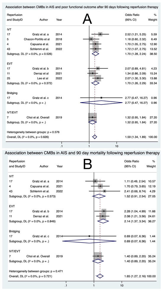 Forest plots of association of cerebral microbleeds with adverse outcomes: (A) poor functional outcome at 90 days [11,15,18,19,21,25,38] and (B) mortality at 90 days [11,15,18,21,25] in acute ischemic stroke patients undergoing reperfusion therapy. Note: Gratz et al. a, b and c correspond to cohorts receiving IVT, EVT and bridging therapy, respectively, in the said study. Abbreviations: IVT = intravenous thrombolysis, EVT = endovascular thrombectomy, OR = odds ratio, CI = confidence interval, p = p-value, DL = DerSimmonian and Laird, I2 = heterogeneity.