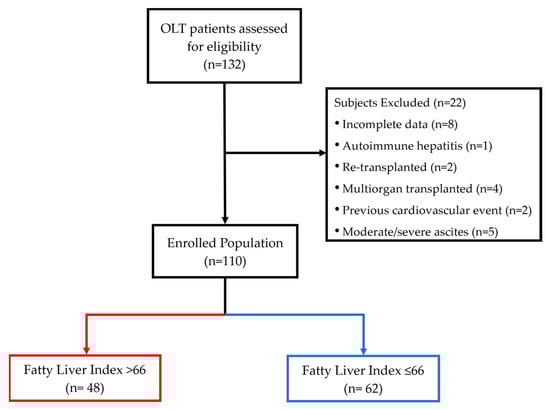 The transplantation procedures were conducted at various hospitals spanning across different regions within Italy and, in some cases, even in other European hospital centers, where patients were generally followed for the first year after OLT. The aetiology of cirrhosis was inferred from the liver biopsy performed before OLT and/or the explant liver biopsy report. The causes of liver disease requiring OLT were distributed as follows: 34 (30.9%) viral cirrhosis, 32 (29.1%) non-viral causes (dysmetabolic, alcoholic and/or cryptogenic cirrhosis; hepatocellular carcinoma with and without cirrhosis), and 44 (40%) both viral and non-viral aetiology. All included patients were in the outpatient setting without evidence of acute graft rejection or dysfunction, technical complications, or active infections. Re-transplanted (n = 2) or multi-organ transplanted patients (n = 4), autoimmune hepatitis (n = 1) and hemochromatosis (n = 0) causes of OLT, and subjects with missing data (n = 8) were excluded from the study. In addition, the pre-OLT presenting symptoms suggestive of CVD, the pre-OLT history of documented cardiovascular events or coronary stent implantation (n = 2), as well as the presence of moderate–severe hydrosaline-retention (n = 5) compromising BMI and waist circumference (WC) evaluation were criteria for exclusion from the study. A total of 110 OLT recipient patients were finally included (Figure 1).