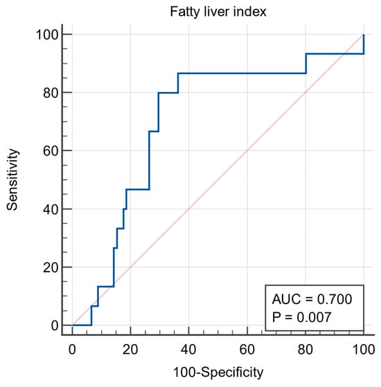 Our FLI cutoff value closely corresponds to the previously established threshold of ≥60, documented in this study as a reliable predictor of arterial hypertension in individuals who have not yet been exposed to antihypertensive medications []. The same FLI threshold has also been associated with significant clinical conditions, such as the onset of left ventricular remodelling and diastolic dysfunction [,]. Of noteworthy significance is a recent extensive population-based cohort investigation that may underscore the clinical relevance of our findings []. In this study, persistent NAFLD, as defined by a FLI score of ≥60, emerged as a potent predictor of adverse outcomes such as all-cause mortality, MI, and stroke when compared to those with either no NAFLD or sporadic, intermittent NAFLD [].