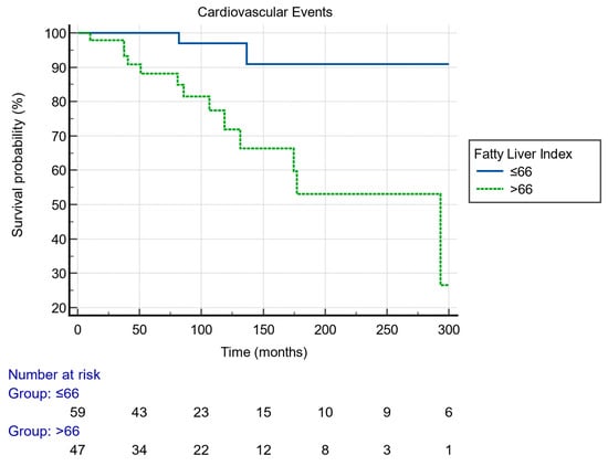 The Kaplan–Meier analysis revealed a worse cardiovascular event-free survival in patients with FLI > 66 compared to those with FLI ≤ 66 (log-rank: 0.0008) (Figure 3).
