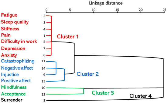 The dendrogram shows the formation of the clusters, as well as the distances between them. It can be seen, for example, that the variables (observations) closest to each other were pain (FIQ_5); fatigue (FIQ_6); sleep quality (FIQ_7); stiffness (FIQ_8); anxiety (Total HADS-A); depression (Total HADS-D); and difficulty at work (FIQ_4), which form the first group (distance closest to 0) and were the closest to each other. These are joined with injustice, catastrophizing (CATAST), negative affect (PANAS_negative) and positive affect (PANAS_positive). On the other hand, it was joined by proximity acceptance (CPAQ) and mindfulness and, finally, a fourth cluster with the variable surrender (Figure 1).