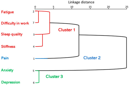 The cluster analysis showed the following: in the first stage, fatigue was clustered with work difficulty. In the second, anxiety was clustered with depression. In the third stage, sleep quality was clustered with rigidity. In the fourth stage, fatigue, work difficulty, sleep quality and stiffness were clustered. In the fifth, pain was combined with fatigue, work difficulty, sleep quality and stiffness. In the sixth, pain, fatigue, work difficulty, sleep quality and stiffness were combined with anxiety/depression (Table 4).