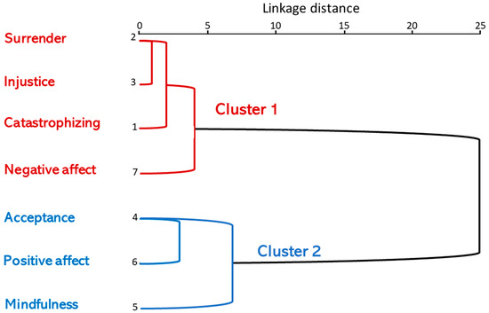 The dendrogram shows the formation of the clusters, as well as the distances between them. It can be seen, for example, that the variables (observations) closest to each other are surrender and injustice, which form the first group (distance closest to 0). These two are joined with catastrophizing and then these three with negative affect, forming a relatively cohesive cluster. On the other hand, acceptance and positive affect were joined by proximity, and this cluster is joined in turn by mindfulness, forming the second cluster (Figure 3).