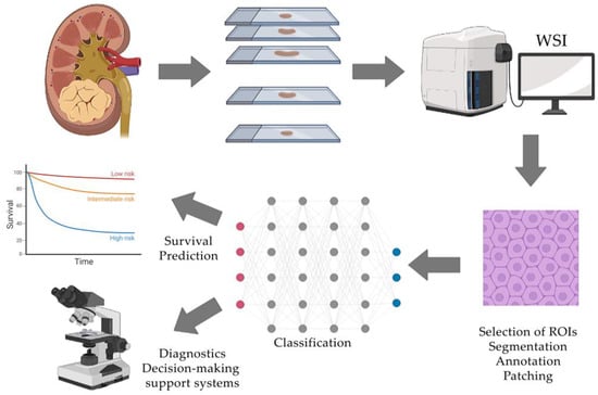 Whole-slide images (WSIs), or scans, of RCC histology slides are typically used for neural network training. WSI—also known as virtual microscopy—is a technique that involves scanning the entire slide and creating a single high-resolution digital file. Most authors use scans that are freely available from biobanks and databases such as The Cancer Genome Atlas (TCGA) [14]. Other researchers digitize slides from the histological archives of universities or medical institutions.