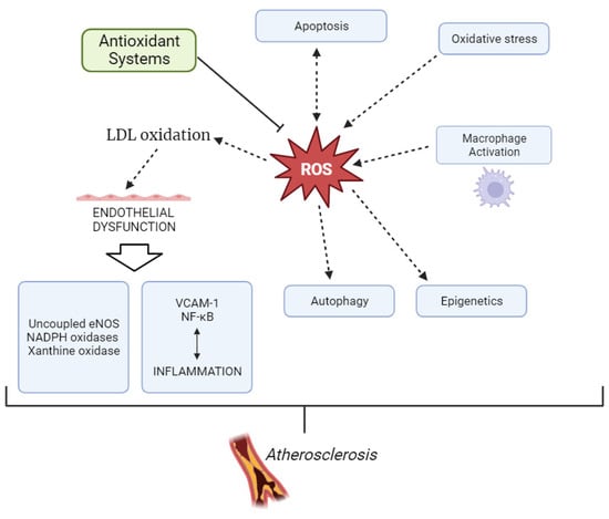The formation of atherosclerotic plaque is initiated by the accumulation of LDL particles, especially sdLDL, and fibrous elements in medium and large arteries, such as the aorta, carotid, and coronary arteries [,]. However, to become atherogenic, LDL needs to undergo chemical modifications, with the most studied being desialylation and oxidation. As recently reviewed by Bale et al. [], virtually all traditional CVD risk factors are able to trigger ROS production or mediate the process of lipoprotein oxidation. Oxidized LDL (ox-LDL) accumulates in predisposed areas of the arterial wall and contributes to an increased expression of cell adhesion molecules on the endothelial cells, such as vascular cell adhesion molecule-1 (VCAM-1). Activation of endothelial VCAM-1 expression is driven by inflammatory signaling, which causes antioxidant-inhibiting mechanisms, involving a redox-sensitive activation of nuclear factor kappa-light-chain-enhancer of activated B cell (NF-κB) []. In addition to ox-LDL and inflammatory mediators, recent data have suggested other mechanisms that are critically important for oxidative stress exacerbation in atherosclerosis, including macrophage cellular oxidation and apoptosis, as well as the role of autophagy and epigenetic processes [,]. Therefore, oxidative stress has been shown to play a major role in the pathogenesis of atherosclerosis (Figure 2) []. In addition to atherosclerotic cardiovascular disease, more recent data suggest that oxidative stress is implicated in the pathogenesis of left ventricular hypertrophy, diastolic dysfunction, heart failure, and ischemia/reperfusion injury [].