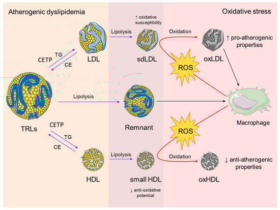 The interplay between atherogenic dyslipidemia and oxidative stress. Atherogenic dyslipidemia is characterized by increased plasma levels of TRLs. It is also associated with enhanced activity of CETP, which mediates the exchange of core TGs in TRLs for CE in LDL and HDL particles. A subsequent process of lipolysis results in the formation of sdLDL and small HDL particles with increased oxidative susceptibility and reduced anti-oxidative potential, respectively. The lipolysis of TRLs generates remnant particles, which are capable of accumulating in the macrophages in their native form. Enhanced production of ROS by the macrophages induces oxidative modifications of sdLDL and HDL particles. The main pro-atherogenic effect of oxLDL particles is reflected by their preferential uptake by macrophages and consecutive foam cell formation, while oxHDL has compromised anti-atherogenic properties. Both oxidized LDL and HDL particles act synergistically in the maintenance of a pro-oxidative state during the progression of atherosclerosis. Abbreviations: TRLs, triglyceride-rich lipoproteins; CETP, cholesteryl ester transfer protein; TG, triglyceride; CE, cholesteryl esters; sdLDL, small dense LDL; ROS, reactive oxygen species, oxLDL, oxidized LDL; oxHDL, oxidized HDL. The figure was composed using Servier Medical Art templates, licensed under a Creative Common Attribution 3.0 (https://smart.servier.com, accessed on 22 August 2023).