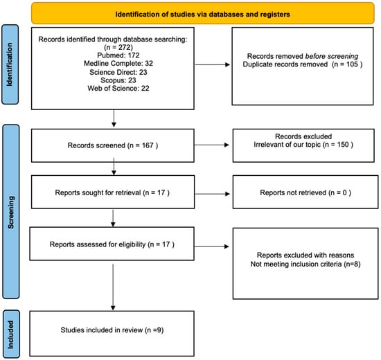 In total, 272 papers were found as a result of the literature search. In total, 172 of those were identified on PubMed, 32 on Medline Complete, 23 on Science Direct, 23 on Scopus, and 22 on Web of Science. A total of 105 papers were excluded because they were duplicates. The reviewers extracted 17 prospectively relevant articles from the remaining 167 screened records. Eventually, only nine full texts met the standards and were included in the review. One was a case study (Stefaniak et al.), one was a review (Levy et al.), one was a research paper (Tang et al.), and six were cohort studies (Snijders et al., Wang et al., Beal et al., Lennox et al., Ng-Cordell et al., and Dai et al.) [7,8,9,12,15,19,23,24,26]. Most of the studies were retrospective.