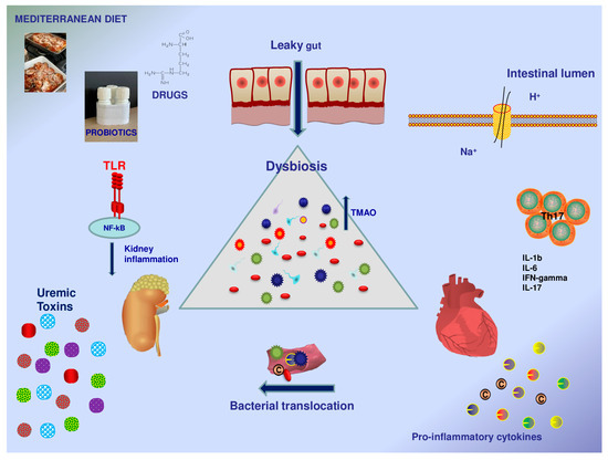 The interaction between the gut and the kidney is complex and also involves the cardiovascular system, thus creating an intricate crosstalk, which is often referred to as the “gut–kidney–heart axis” [9]. While the mechanisms underlying its functions are not yet completely clear, our understanding is improving thanks to different studies that have been carried out in the last few years [10].