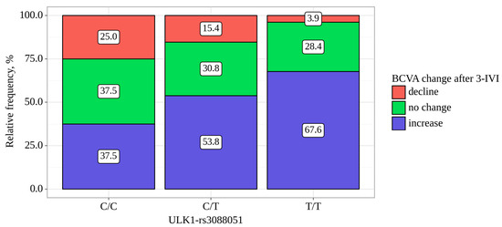 The BCVA was increased in 117 (59.7%) patients by 10 [5–20] letters, did not changed in 59 (30.1%) and was decreased in 20 (10.2%) patients. ULK1-rs3088051 was associated with BCVA change. Among patients with the TT and CT genotypes for the ULK1-rs3088051, an improvement in visual acuity was noted in 67.6% and 53.8% of cases, while in patients with the CC genotype, an increase in BCVA was recorded in 37.5% of cases (p = 0.01) (Table 7, Figure 1). Moreover, in carriers of the CC genotype, the median BCVA change was the smallest—0 letters (IQR −0 to −6 letters)—while in CT and TT carriers, it was 5 letters (IQR 0 to 12 letters) and 5 letters (IQR 0 to 16 letters), respectfully (p = 0.008, Table 7).