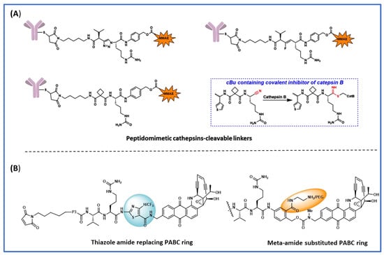 Various Linker payload designs for faster lysosomal cleavage and improved plasma stability. (A) Peptidomimetic linkers specifically cleaved by cathepsin B; (B) modifications to central PABC ring.