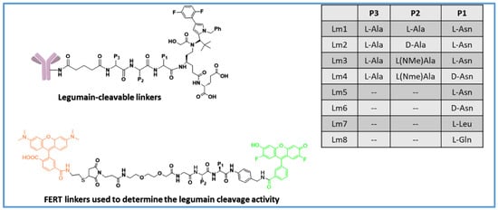 In a high throughput enzyme agnostic screening, Miller et al. used a Förster resonance energy transfer (FRET) assay to study cleavage efficiency in lysosomal extracts and stability in human and mouse plasma of 75 peptide FERT pairs (Figure 5) [50]. They found that various Asn-containing dipeptide sequences were readily cleaved by legumain. In enzyme-based assays, peptide sequences, like AsnAsn, AsnAla, were selectively cleaved by legumain and very stable towards cathepsin B. The newly identified Asn peptide linkers were found to be very stable in mouse plasma and resistant to Ces1c-mediated cleavage. They synthesized anti-Her2 and anti-CD20 ADCs with the AsnAsn, GlnAsn, AlaAsn, ValCit dipeptide-PABC-MMAE linker–payload system, using cysteine–maleimide chemistry for conjugation (DAR~6). In vitro cytotoxicity of the ADCs was evaluated using Her-2-expressing SKBR3 cells and CD20-expressing Ramos cells. Compared with the cathepsin-cleavable ValCit ADCs, the legumain-cleavable ADCs showed similar activities; however, Asn-containing ADCs showed 2–3-fold higher off-target activity than the ValCit ADC. The reduced selectivity of legumain-cleavable ADCs is likely because that legumain is also secreted in the tumor microenvironment, and thus, might have caused extracellular linker cleavage.