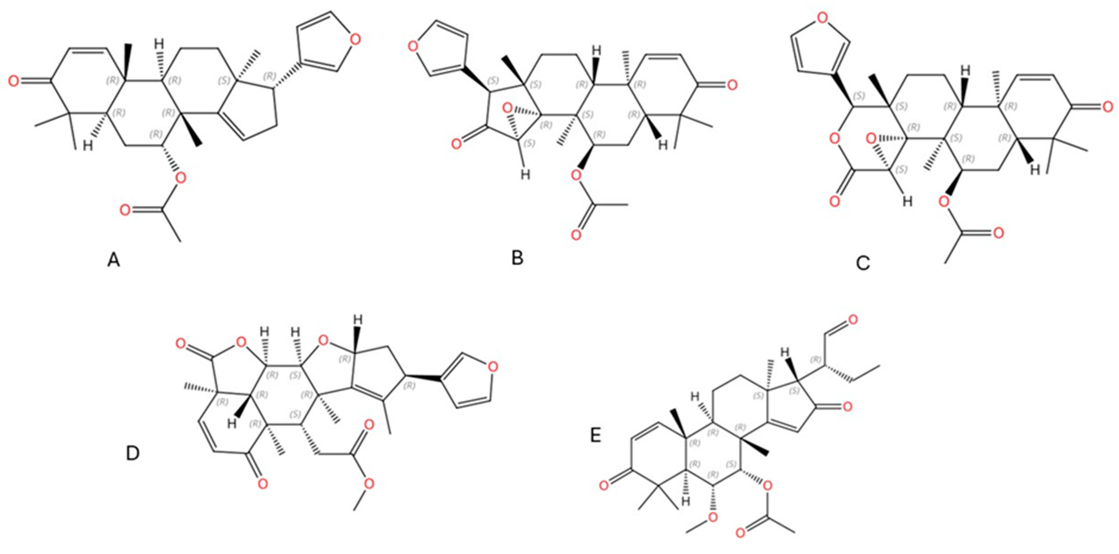 - Lin, M.; Yang, S.; Huang, J.; Zhou, L. Insecticidal Triterpenes in Meliaceae: Plant Species, Molecules and Activities: Part I (Aphanamixis-Chukrasia). Int. J. Mol. Sci. 2021, 22, 13262. [Google Scholar] [CrossRef] [PubMed]