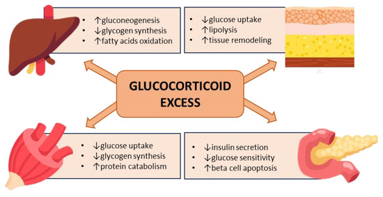 In summary, chronic hypercortisolism may have pleiotropic effects on all major peripheral tissues governing glucose homeostasis, leading to insulin resistance and an impairment of insulin secretion, acting through genomic and nongenomic mechanisms in a context-specific and cell-/organ-dependent manner [46] (Figure 2). In addition to glucocorticoid excess, the impairment of circadian glucocorticoid secretion also contributes to metabolic abnormalities [52].
