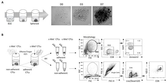 Schematic diagram of protocol for B16 spheroid formation and cytotoxic in vitro test. (A) Representative images on the right show the aggregates formed by B16 melanoma cells (1000 cells seeded) over 7 days. The images were acquired with a Zeiss Observer Z1 microscope. Scale bar, 200 µm. (B) Diagram illustrating the different steps of 3D B16 culture process model with c-Met+ and c-Met− CTLs (left panel), and the gating strategy for B16 cells and CTLs (right panel).