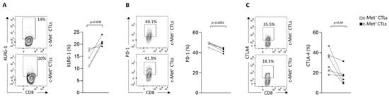 Immune checkpoint molecules’ modulation of c-Met+ vs. c-Met− CTLs in contact with 3D B16 spheroids. (A–C) Representative contour plots (left panel) and paired flow cytometry quantifications (right panels) of KLRG1, PD1, and CTLA-4 expression on c-Met+ vs. c-Met− CTLs, 4 h after co-culture with B16 spheroids (n = 6 mice). p-values were calculated using a paired t-test. Data of figures (A–C) are representative of three independent experiments.