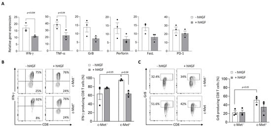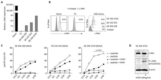 The receptor tyrosine kinase c-Met plays a pivotal role in embryonic development and tissue regeneration, and influences critical cellular processes such as cell survival, proliferation, migration, and angiogenesis [] The HGF/c-Met axis actively participates in the regulation of numerous inflammatory-mediated diseases by engaging a diverse array of cell types []. Extensive research has established the HGF/c-Met signaling pathway as a promising target for personalized cancer treatment, especially when expressed on tumor cells [,]. However, it is worth noting that only patients with tumors overexpressing c-Met can benefit from HGF/c-Met targeting therapy, as these interventions inhibit typical c-Met-associated processes such as oncogenesis, cancer metastasis, and drug resistance []. Our previous research demonstrated that HGF treatment reduced the effector capacity of tumor-specific CD8+ T cells in a murine model of CTL-mediated killing []. These findings highlighted the pivotal role of c-Met expression on tumor-infiltrating CD8+ T cells in enhancing their anti-tumoral functions and restraining tumor growth []. Nonetheless, the existence of c-Met-expressing CTLs in human settings, as well as the mechanisms governing their functions in response to HGF within the TME, remains unanswered.