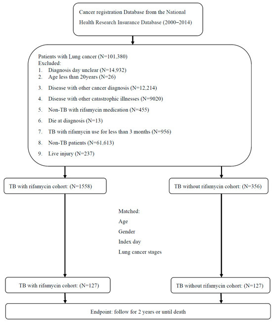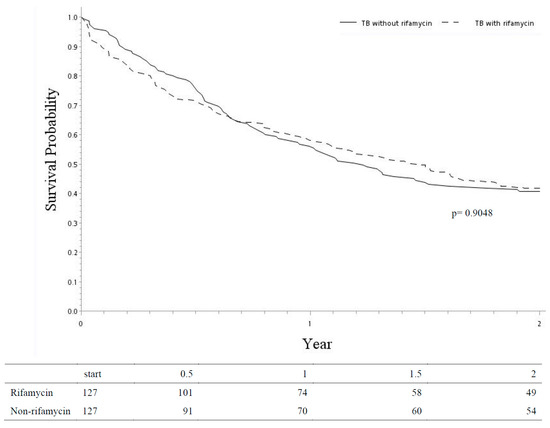 However, rifamycins are strong inducers of cytochrome P-450 (CYP) enzymes [8], which subsequently enhance the metabolism of some pivotal agents for LC treatment, e.g., epidermal growth factor receptor–tyrosine kinase inhibitors (EGFR-TKIs) and other TKIs [9,10,11], and chemotherapy agents such as docetaxel, paclitaxel, and vinorelbine [12,13]. In addition, although therapeutic monoclonal antibodies of immunotherapy do not directly interact with CYP enzymes, the immune response may affect the level of CYP enzymes [14]. Therefore, the decreasing effect of anti-cancer agents with concomitant rifamycin use has raised concerns about survival among patients with LC and TB worsening due to rifamycin use. Few studies have investigated this issue. Hence, we conducted the present study to analyze the influence of rifamycin use on two-year survival among patients with concomitant LC and pulmonary TB.