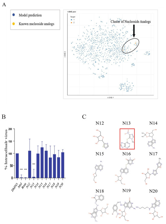 To distinguish potential nucleoside analogs from other compounds, we employed the t-distributed stochastic neighbor embedding (t-SNE) method from the ChemPlot chemical space visualization library [47]. This clustering technique was applied to the top 1000 compounds predicted by our model, along with the original nucleoside analogs used during training. The analysis resulted in the identification of a distinct cluster of nucleoside analogs. Notably, several compounds predicted by the KCB were closely aligned with this cluster, suggesting their potential as nucleoside analog inhibitors (Figure 3A).