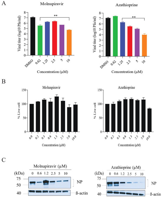 We investigated the dose-dependent antiviral effects of azathioprine on the Calu-3 cell line, a model commonly used in SARS-CoV-2 research [48,49,50]. After infecting the cells with the virus, we treated them with varying concentrations of azathioprine, up to a maximum of 10 µM. As a control, we used molnupiravir, a known virus inhibitor. Our analyses, including plaque assays and Western blotting, indicated a significant reduction in viral progeny within the cells treated with azathioprine (Figure 4A,C), highlighting its potential as a potent antiviral agent against SARS-CoV-2. Furthermore, the low cellular toxicity observed at these concentrations reinforces the drug’s safety profile (Figure 4B). While molnupiravir exhibited moderate inhibitory effects, which we further confirmed using RT-PCR assay (Figure S3), it is important to note that the antiviral efficacy observed may vary depending on the cell line used, given differences in drug uptake and metabolic pathways.