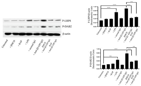 Analysis of Western blot showed that affinity-purified human anti-β2-GPI antibodies, as well as LPS, induced LRP8 phosphorylation in HUVECs (Figure 1). When cells were incubated with normal human IgG, virtually no anti-phospho-LRP8 reactivity was evident. Preincubating cells with MβCD, a lipid rafts affecting agent, or RAP, an inhibitor of ligand binding to LRP8 [41,42], almost completely prevented the anti-β2-GPI-triggered LRP8 phosphorylation, suggesting that the integrity of lipid rafts is necessary for the anti-β2-GPI-mediated effect, thereby leading to LRP8 phosphorylation. Furthermore, anti-β2-GPI antibodies, as well as LPS, induced Dab2 phosphorylation. Again, preincubating cells with MβCD or RAP almost completely prevented the anti-β2-GPI-triggered Dab2 phosphorylation, further supporting that both lipid rafts and LRP8 signaling are involved in the anti-β2-GPI-mediated effect. As a loading control, β-actin was employed. To exclude the possibility of LPS contamination, experiments were also carried out by preincubating cells with polymyxin B, which did not affect LRP8 or Dab2 phosphorylation triggered by anti-β2-GPI antibodies.