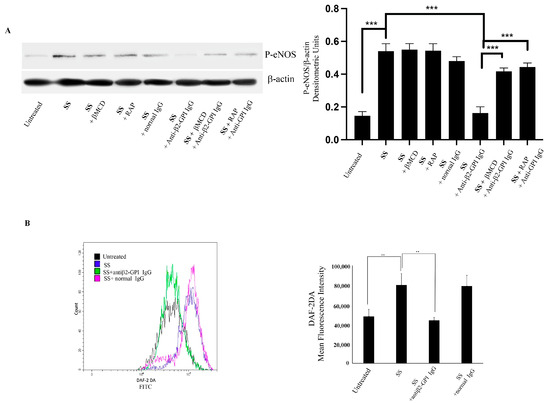 (A) eNOS phosphorylation following triggering with anti-β2-GPI antibodies. HUVECs, exposed to shear stress (SS) for 24 h using an orbital shaker, treated with affinity-purified anti-β2-GPI antibodies for 45 min or left untreated, or with normal human serum IgG, in the presence or in the absence of MβCD or RAP, were analyzed with Western Blot using anti-eNOS Ab. As a loading control, β-actin was employed. Densitometric analysis is shown. Results represent the mean ± SD from 3 independent experiments. *** p < 0.001. (B) NO intracellular production following triggering with anti-β2-GPI antibodies. HUVEC cells were exposed to shear stress (SS) for 24 h using an orbital shaker. Cells, treated with anti-β2-GPI antibodies or with IgG normal for 45 min at 37 °C, or left untreated, were incubated with 5 mM of DAF-2 DA at 37 °C for 30 min and analyzed with flow cytometric analysis. Representative flow cytometry histograms are shown. Columns and error bars represent the mean ± D of three separate experiments. ** p < 0.005.