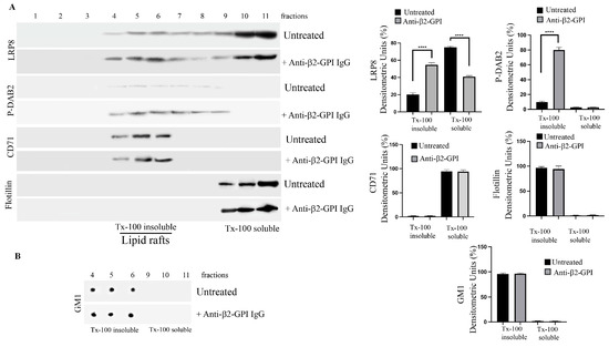 In a previous paper [9], we have demonstrated that the anti-β2-GPI triggering induced β2-GPI enrichment in TX-100 insoluble fractions, suggesting that lipid rafts represent the plasma membrane sites from which β2-GPI promotes the signaling cascade upon binding to its ligand. Thus, the distribution of LRP8 and phospho-Dab2 was evaluated in the raft fractions of EC. For this purpose, 11 fractions, which include both TX-100-insoluble (4–6) and TX-100-soluble (9–11) fractions, were recovered with sucrose gradient and then analyzed using Western blot (or dot blot for GM1). As expected, in untreated cells, LRP8 was present in TX-100-insoluble fractions corresponding to lipid rafts [26] and in those TX-100-soluble fractions; by contrast, under the triggering condition with anti-β2GPI antibodies, LRP8 was mostly enriched in TX-100-insoluble fractions, as revealed via densitometric analysis (Figure 3). Interestingly, phosphorylated Dab2 was also present in these TX-100-insoluble fractions, following the anti-β2-GPI triggering. All fractions were determined using three specific markers, flotillin and GM1, specific for lipid rafts, and CD71, which is excluded by lipid rafts. As expected, we observed that flotillin, as well as GM1, was consistently enriched in TX-100-insoluble fractions 4–6; by contrast, CD71 was localized exclusively in those TX-100-soluble fractions.