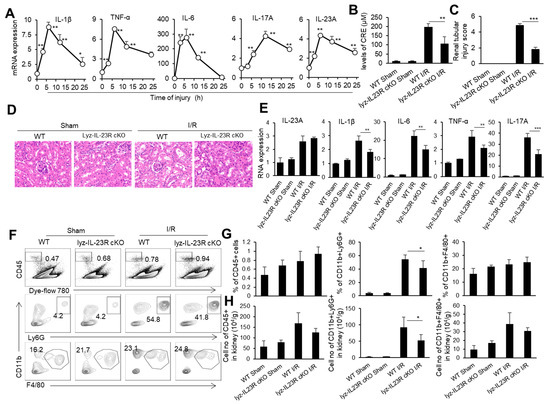 The cytokine mRNA expression, immune cell infiltration, and injury in the kidneys of WT and Lyz-IL-23R cKO mice after I/R. (A) Relative mRNA expression of IL-1β, TNF-α, IL-6, IL-17A, and IL-23A in the renal tissue of WT C57BL/6 mice at 0, 3, 6, 12, and 24 h after IR (n = 3). (B) Serum creatinine levels of WT and Lyz-IL-23R cKO mice in the sham operation group and I/R group at 24 h after I/R (n = 3). (C) Renal injury scores of the WT and Lyz-IL-23R cKO mice in the sham operation group and I/R group at 24 h after IR (n = 3). (D) Representative H&E-stained renal sections of WT and Lyz-IL-23R cKO mice in the sham operation group and I/R group at 24 h after I/R (n = 3). (magnification × 10000) (E) Relative mRNA expression of IL-1β, TNF-α, IL-6, IL-17A, and IL-23A in the renal tissue of WT and Lyz-IL-23R cKO mice in the sham operation group and I/R group at 24 h after I/R (n = 3). (F) Flow cytometry analysis of CD45+, CD45+CD11b+Ly6G+, and CD45+CD11b+F4/80+cells in the renal tissue of WT and Lyz-IL-23R cKO mice in the sham operation group and I/R group at 24 h after I/R (n = 3). (G) The proportion of CD45+, CD45+CD11b+Ly6G+, and CD45+CD11b+F4/80+ cells in the renal tissue of WT and Lyz-IL-23R cKO mice in the sham operation group and IR group at 24 h after I/R (n = 3). (H) The cell numbers of CD45+, CD45+CD11b+Ly6G+, and CD45+CD11b+F4/80+ cells in the renal tissue of WT and Lyz-IL-23R cKO mice in the sham operation group and I/R group at 24 h after I/R (n = 3). Data are means ± SD. * p < 0.05; ** p < 0.01; *** p < 0.001.