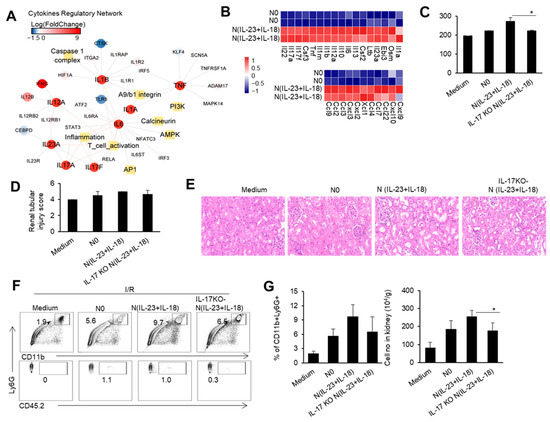 The cytokine and chemokine expression profile in N(IL-23+IL-18), and the effect of adoptively transferred WT and IL-17KO N(IL-23+IL-18) on the kidney IRI. (A) Cytokine regulatory network summary of N(IL-23+IL-18). (B) The heatmap of differentially expressed cytokines and cytokine receptors in N0 and N(IL-23+IL-18). (C) Serum creatinine levels in mice with adoptively transferred culture medium, N0, N(IL-23+IL-18), and IL-17KO N(IL-23+IL-18) neutrophils at 24 h after I/R (n = 3). (D) Renal tubular injury scores in mice with adoptively transferred culture medium, N0, N(IL-23+IL-18), and IL-17KO N(IL-23+IL-18) neutrophils at 24 h after I/R (n = 3). (E) Representative H&E-stained renal sections of mice with adoptively transferred culture medium, N0, N(IL-23+IL-18), and IL-17KO N(IL-23+IL-18) neutrophils at 24 h after I/R (n = 3). (magnification × 10000) (F) Flow cytometry analysis of CD11b+Ly6G+ and CD45.2+CD11b+Ly6G+ cells in the renal tissue of mice with adoptively transferred medium, N0, N(IL-23+IL-18), and IL-17KO N(IL-23+IL-18) neutrophils at 24 h after I/R (n = 3). (G) The proportion and cell numbers of CD11b+Ly6G+ and CD45.2+CD11b+Ly6G+ cells in the renal tissue of mice with adoptively transferred medium, N0, N(IL-23+IL-18), and IL-17KO N(IL-23+IL-18) neutrophils at 24 h after I/R (n = 3). Data are means ± SD. * p < 0.05.