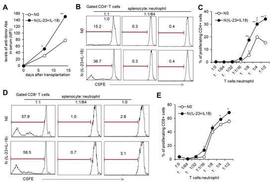 T cell proliferation stimulated by allogeneic N(IL-23+IL-18) neutrophils in vitro. (A) The levels of antidonor antibodies in the sera of C57BL/6 mice received allogeneic N0 and N(IL-23+IL-18) neutrophils on day 0, 7, and 14 after adoptive transfer (n = 3). (B) Flow cytometric analysis of the proliferation of CD4+ T cells stimulated by allogeneic N0 and N(IL-23+IL-18) neutrophils in vitro (n = 3). (C) Statistical analysis of CD4+ T cell proliferation stimulated by allogeneic N0 and N(IL-23+IL-18) neutrophils, respectively (n = 3). (D) Flow cytometric analysis of the proliferation of CD8+ T cells stimulated by allogeneic N0 and N(IL-23+IL-18) neutrophils. (E) Statistical summary of CD8+ T cell proliferation stimulated by allogeneic N0 and N(IL-23+IL-18) neutrophils, respectively (n = 3). Data are means ± SD. * p < 0.05; ** p < 0.01.