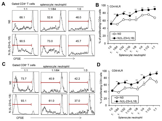 The effects of syngeneic N(IL-23+IL-18) neutrophils on T cell proliferation stimulated by allogeneic antigens in MLR assays. (A) Flow cytometry was used to detect the proliferation of CD4+ T cells stimulated by allogeneic antigens in the presence of syngeneic N0 and N(IL-23+IL-18) neutrophils, respectively (n = 3). (B) Statistics of CD4+ T cell proliferation stimulated by allogeneic antigens in the presence of syngeneic N0 and N(IL-23+IL-18) neutrophils in vitro (n = 3). (C) Flow cytometry was used to detect the proliferation of CD8+ T cells stimulated by allogeneic antigens in the presence of syngeneic N0 and N(IL-23+IL-18) neutrophils, respectively (n = 3). (D) Summary of the proliferation of CD8+ T cells stimulated by allogeneic antigens in the presence of syngeneic N0 and N(IL-23+IL-18) neutrophils, respectively (n = 3). Data are means ± SD. * p < 0.05; ** p < 0.01.