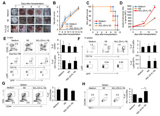 To investigate whether recipient N(IL-23+IL-18) neutrophils play a role in allogeneic graft rejection, we employed a mixed-lymphatic-culture system with the addition of recipient N0 and N(IL-23+IL-18) neutrophils into the classic one-way mixed-lymphocyte reaction assays in vitro, in which irradiated allogeneic BALB/c splenocytes were used as allogeneic-stimulating antigens and B6 splenocytes as responder cells. We found that recipient N(IL-23+IL-18) neutrophils significantly enhanced the proliferation of recipient T cells in a mixed-lymphatic-culture system compared with N0 neutrophils (Figure 7A–D). To validate the effect of recipient N(IL-23+IL-18) neutrophils on allogeneic skin rejection, we used BALB/c tail skin as a donor graft and transplanted it to B6 recipient mice with the injection of C57BL/6 N(IL-23+IL-18) neutrophils. The adoptive transfer of recipient N(IL-23+IL-18) neutrophils did not significantly alter the time course of skin-graft rejection (Figure 8A–C). However, the antidonor IgG levels in the sera of mice with the adoptive transfer of recipient N(IL-23+IL-18) neutrophils were significantly higher than those of the other two groups (Figure 8D). Based on the above phenomena, we wanted to further explore how recipient N(IL-23+IL-18) neutrophils promote an immune response in skin-rejection models. To facilitate the neutrophil infiltration in recipient mice, we used C57BL/6 mice expressing the GFP fluorescent protein to prepare the recipient N0 and N(IL-23+IL-18) neutrophils, and detected the infiltration of the adoptively transferred syngeneic neutrophils on the 9th day after transplantation (Figure 8E,F). We were unable to detect the transferred GFP+ neutrophils in the skin grafts, but a certain proportion of GFP+ cell infiltration was detected in the spleens of the mice, indicating that recipient N(IL-23+IL-18) neutrophils can migrate to the recipient spleens and play a role. Meanwhile, the overall level of Tfh cells in the mouse spleens was significantly increased after the adoptively transferred recipient N(IL-23+IL-18) neutrophils compared to other experimental groups (Figure 8G,H). This result can explain the increase in antidonor antibody levels.