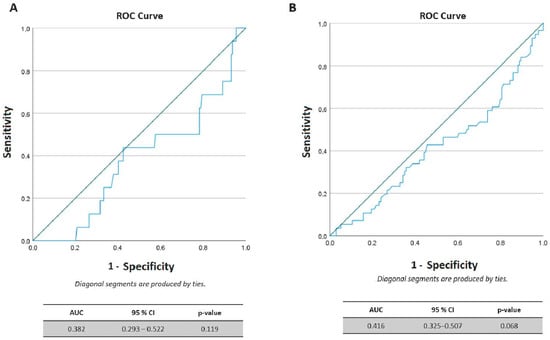 A binomial logistic regression analysis was conducted to adjust for confounders’ effect on live birth. The model included age, BMI, FSH, and AMH as independent variables. No significant association was revealed between AMH and live birth (p = 0.104) or cumulative live birth (p = 0.175). Similarly, the predictive power of baseline AMH for live birth and cumulative live birth was explored using ROC curves (Figure 1). The area under the curve (AUC) of 0.382 (0.293–0.522, 95% confidence interval, p = 0.119) for live birth and 0.416 (0.325–0.507, 95% confidence interval, p = 0.068) for cumulative live birth indicates overall poor predictive value.