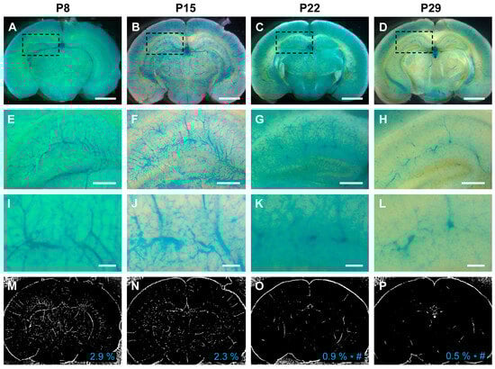 - Walchli, T.; Mateos, J.M.; Weinman, O.; Babic, D.; Regli, L.; Hoerstrup, S.P.; Gerhardt, H.; Schwab, M.E.; Vogel, J. Quantitative assessment of angiogenesis, perfused blood vessels and endothelial tip cells in the postnatal mouse brain. Nat. Protoc. 2015, 10, 53–74. [Google Scholar] [CrossRef]