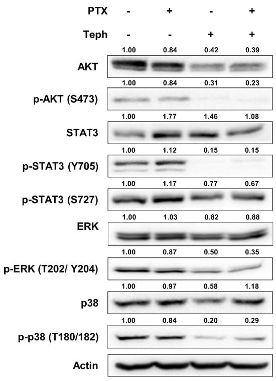 Previous studies have reported that intracellular signaling factors such as PI3K/AKT [,], STAT3 [], ERK [], and p38 MAPK [] are closely related to cell proliferation and survival. Additionally, these factors are known to mediate the chemoresistance of various cancers [,,,,,,,,]. To determine whether tephrosin affects the PI3K/AKT, STAT3, ERK, and p38 MAPK signaling pathways in SKOV3-TR cells, immunoblotting was examined. As a result of Figure 2, the phosphorylation levels of AKT (S473), STAT3 (Y705), ERK (T202/Y204), and p38 MAPK (T180/T182) were effectively inhibited in a treatment composed of tephrosin alone and in a combination treatment made up of paclitaxel and tephrosin. These data suggested the possibility that tephrosin reverses chemoresistance by downregulating the prosurvival signaling pathway of paclitaxel-resistant ovarian cancer cells.