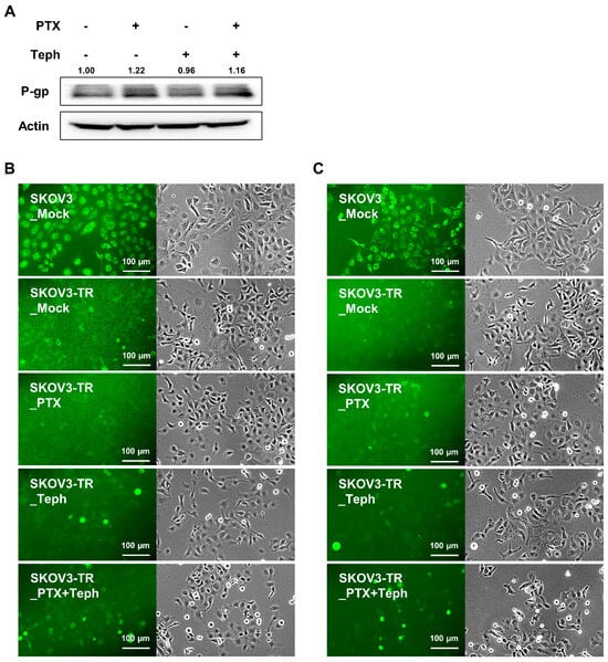 Accumulating amounts of evidence are showing that P-gp has substrates for several anticancer drugs, including paclitaxel and cisplatin, and its overexpression has been reported to be closely related to the chemoresistance of various cancers [,,]. To investigate whether P-gp was overexpressed in SKOV3-TR cells compared to SKOV3 cells, immunoblotting was performed (Figure S2). The expression of P-gp was overexpressed in SKOV3-TR cells compared to SKOV3 cells. To determine whether tephrosin affects the expression of P-gp in SKOV3-TR cells, immunoblotting was analyzed. As shown in Figure 4A, the combination treatment composed of paclitaxel and tephrosin had no effect on the expression of P-gp in SKOV3-TR cells. It has been reported that the fluo-3/AM is a cell-permeable fluorescent molecule that acts as a substrate for P-gp and can be used to evaluate the function of P-gp []. In Figure 4B, SKOV3-TR cells did not show fluorescence after fluo-3/AM treatment compared to SKOV3 cells. Additionally, fluo-3/AM fluorescence was not observed in SKOV3-TR cells, even when tephrosin and paclitaxel were treated alone or together at 24 h and 48 h (Figure 4B,C). Collectively, these data suggested that the tephrosin-induced mechanism of restoring chemoresistance is not related to the expression and function of P-gp.