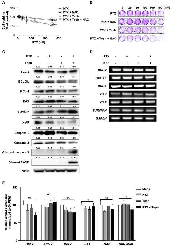 Previous studies have reported that the regulation of endogenous ROS levels and the total antioxidant capacity of cells involves cancer proliferation, cellular apoptosis, and drug sensitivity [,,]. To determine whether cellular apoptosis caused by the treatment combination composed of paclitaxel and tephrosin was mediated by intracellular ROS, N-acetylcysteine (NAC) was added in the treatment combination made up of paclitaxel and tephrosin in SKOV3-TR cells. As shown in Figure 5A, decreased cell viability caused by the treatment combination composed of paclitaxel and tephrosin was not restored by treatment with NAC (p > 0.05). The crystal violet analysis also showed that cell viability was effectively decreased by treatment with paclitaxel and tephrosin, regardless of NAC treatment (Figure 5B). It has been reported that changes in the expression of intracellular apoptosis factors such as the BCL-2 family regulate apoptosis and chemoresistance in cancer [,]. In Figure 5C, immunoblotting showed no significant difference in the expression of BCL-2, BCL-XL, MCL-1, BAX, or Survivin. Interestingly, the expression of the X-linked apoptosis protein (XIAP) was inhibited by the treatment with tephrosin alone and the combination treatment with paclitaxel and tephrosin. In addition, the expressions of cleaved caspase 3 and cleaved PARP were effectively increased using the combination treatment with paclitaxel and tephrosin. RT-PCR and RT-qPCR tests showed that there was no difference in the transcriptional expression of BCL-2, BCL-XL, MCL-1, BAX, XIAP, or SURVIVIN (Figure 5D,E). When the difference in the gene expression of BCL-2, BCL-XL, MCL-1, BAX, XIAP, and SURVIVIN was quantified, it was non-significant, as shown in Figure 5E (p > 0.05). These results indicated that tephrosin inhibits the expression of XIAP in paclitaxel-treated SKOV3-TR cells.