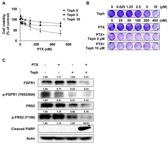 The cytotoxicity effect of combination treatment with paclitaxel and tephrosin in other paclitaxel-resistant ovarian cancer cell lines. (A) HeyA8-MDR cells were seeded in 96-well plates for 24 h. Cells were then treated with serially diluted paclitaxel (0–500 nM) with dose-varying combinations of tephrosin (0, 5, and 10 µM) for 48 h. Cell viability was measured through the WST-1 assay. (B) HeyA8-MDR cells were seeded in 24-well plates. After 24 h of incubation, cells were treated with paclitaxel (0, 25, 50, 100, 200, and 400 nM) with dose-different combinations of tephrosin (0, 5, and 10 µM) for 48 h. Additionally, cells were treated with serially diluted tephrosin (0–10 µM). The visualization of cell viability was determined using the crystal violet assay. (C) HeyA8-MDR cells were treated with DMSO (mock), paclitaxel (200 nM), tephrosin (10 µM), and combination treatment with paclitaxel and tephrosin for 48 h. Immunoblotting was performed to determine the expressions of FGFR1, FRS2, and their phosphorylation forms. Actin was used as a loading control. Protein expression levels were quantified relative to the control, following normalization to the corresponding expression of actin using ImageJ software. All experiments were repeated three times. Significant differences were calculated using one-way ANOVA, and * p ≤ 0.05, as analyzed using the concentration, was considered significant. PTX, paclitaxel; Teph, tephrosin.